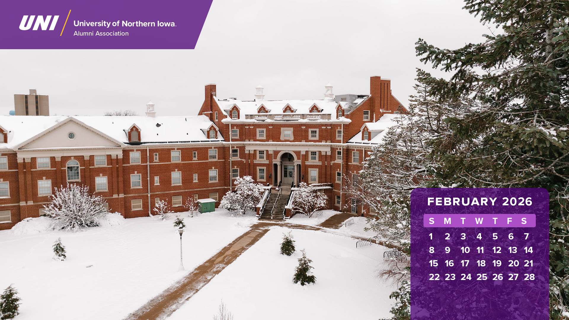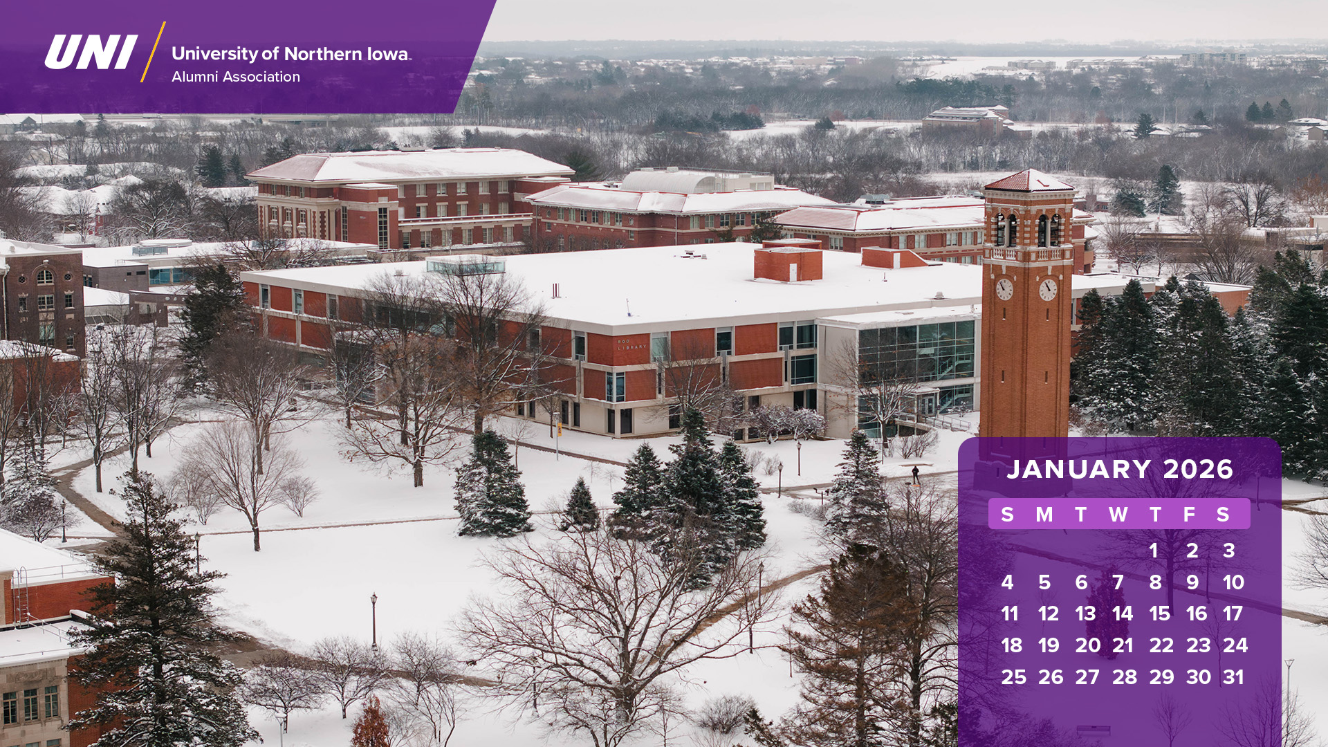 Looking for a calendar? Download these photos of the UNI campus to use as desktop backgrounds on your computer. Just click on the month you would like to download and save that image to your computer. You should be able to adjust your desktop background in your computer's control panel.